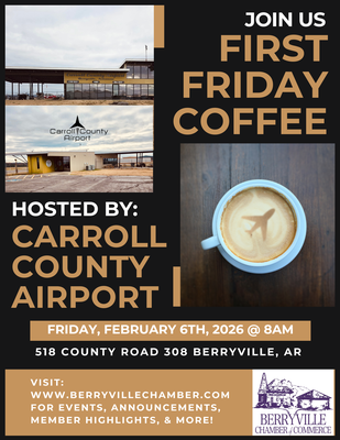 February’s First Friday Coffee takes networking to new heights at the Carroll County Airport! Join the Berryville Chamber of Commerce for a relaxed, come-and-go morning of coffee, conversation, and connections with fellow business owners, professionals, and community leaders. Enjoy fresh coffee while learning more about the airport’s role in our local economy and the opportunities it brings to Berryville and Carroll County. Whether you’re a long-time Chamber member or new to the community, this is the perfect way to start your Friday, grow your network, and stay engaged with what’s happening locally.