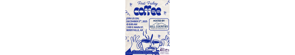 Join the Berryville Chamber of Commerce for our First Friday Coffee on Friday, December 5th at 8:00 a.m., hosted by Hill Country Clinic of Chiropractic, located at 1105 S. Main Street in Berryville. Start your morning with a fresh cup of coffee, friendly faces, and great conversation as we gather to network and celebrate our local business community. This casual meet-up is the perfect way to connect, collaborate, and kick off the month with positive energy!
